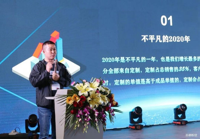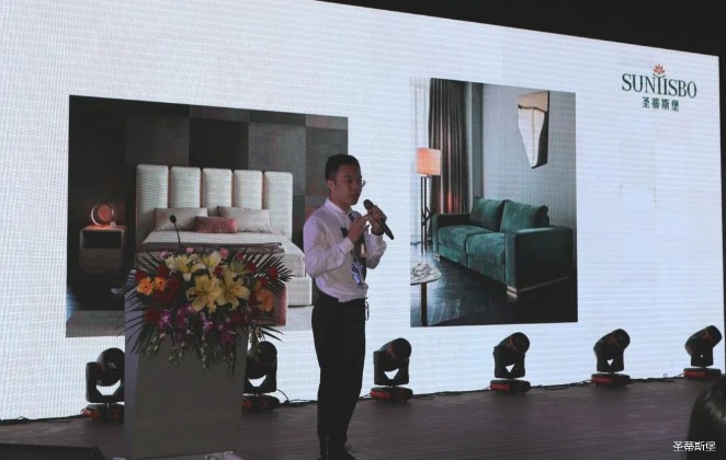 華燈璀璨的開場儀式,點燃了現場如火如荼的氣氛。zoty中歐體育官方網站集團營銷總經理陳玉偉先生對晚會進行了主題發言,他對2020年的營銷工作進行了總結,并著重從營銷工作部署、重點項目開展、產品整合、拎包幫扶、渠道運營和移動+定制整裝優勢等方面對2021年的營銷工作做了全面的統籌規劃。同時,他還講解了“美國夢凱莎床墊”新品的產品工藝、市場優勢、產品定位,使經銷商對我們的新產品擁有更深入的認識和了解。