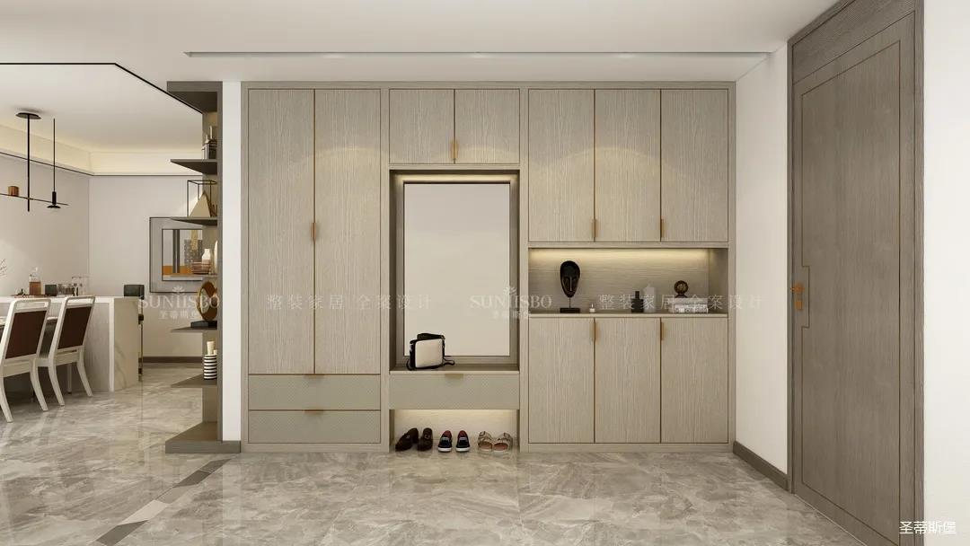 玄關(guān)柜采用內(nèi)嵌式設(shè)計(jì),柜體合理分區(qū),可涵蓋大量入戶閑置物品。