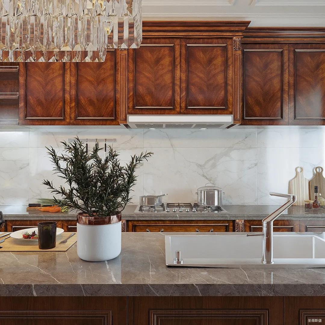 客廳重點強調優雅的雕刻和舒適的設計,在保留了美式家具色澤和質感的同時,又注意現代生活空間。大開窗將光線引入客廳,傍晚時分,當落日余暉灑進屋內,猶如在塞納河畔欣賞落日的浪漫,溫馨又撫慰人心。