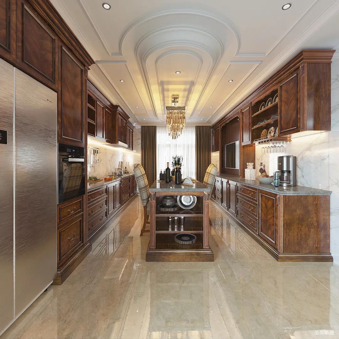西廚設計更為統一,女業主喜好柔美優雅的視覺效果,因此設計師特意將吊頂轉角做了圓弧處理,使冷峻的空間略帶圓潤,形成精致協調的空間格局。簡潔的石膏吊頂與吧臺一致延伸,讓廚房視覺空間得以擴大。金屬元素水晶吊燈,增加了空間的精致感,美式定制柜體將古典元素與現代電器相糅合,交錯產生一種自然的違和感。
